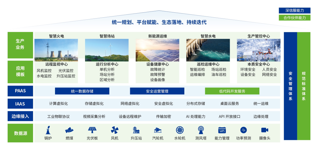 随着发电行业数字化转型进入深水区,不断涌现的业务、管理及新兴应用系统和呈几何式增长的各类型数据资源,需要发电集团、省公司和电厂侧构建完善的云平台进行集中资源管理和应用承载。深信服以信服云多年来的创新能力与经验成果为《白皮书》编撰了云计算平台板块,可帮助发电企业提升云化能力应对数字化转型下不断出现的新场景、新需求。深信服认为发电行业数字化转型蓝图分层构成,分为数据源、边缘接入层、IaaS、PaaS、应用模块、生产业务六大层,深信服分别在边缘接入层、IaaS层、PaaS层为用户的数字化转型提供云化能力,其中包含超融合技术构建智慧发电云底座平台、桌面云+零信任技术构建电力企业数字化办公空间以及信服云云边协同解决方案。