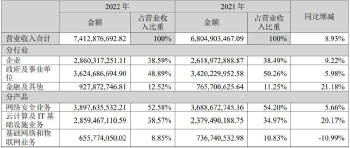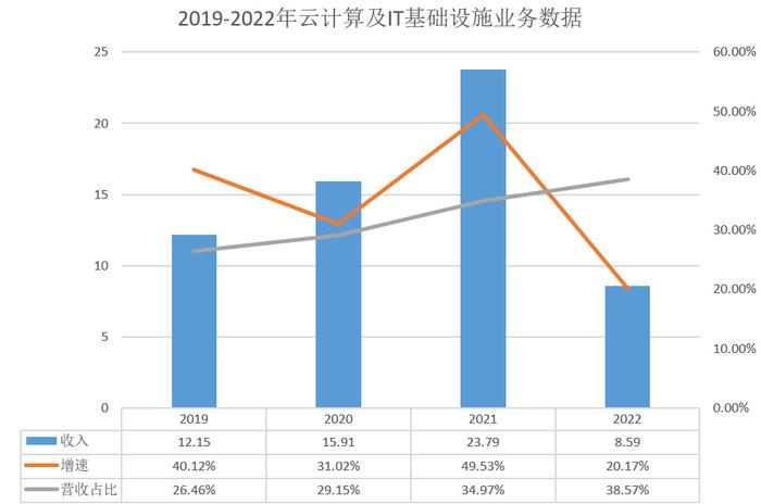2019-2021年,其云计算及IT基础设施业务收入分别为12.15亿元、15.91亿元、23.79亿元,同比分别增长40.12%、31.02%、49.53%,占当期营业收入的比重分别为26.46%、29.15%、34.97%。