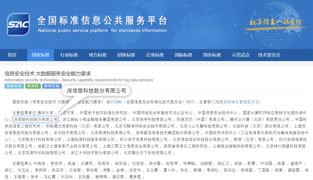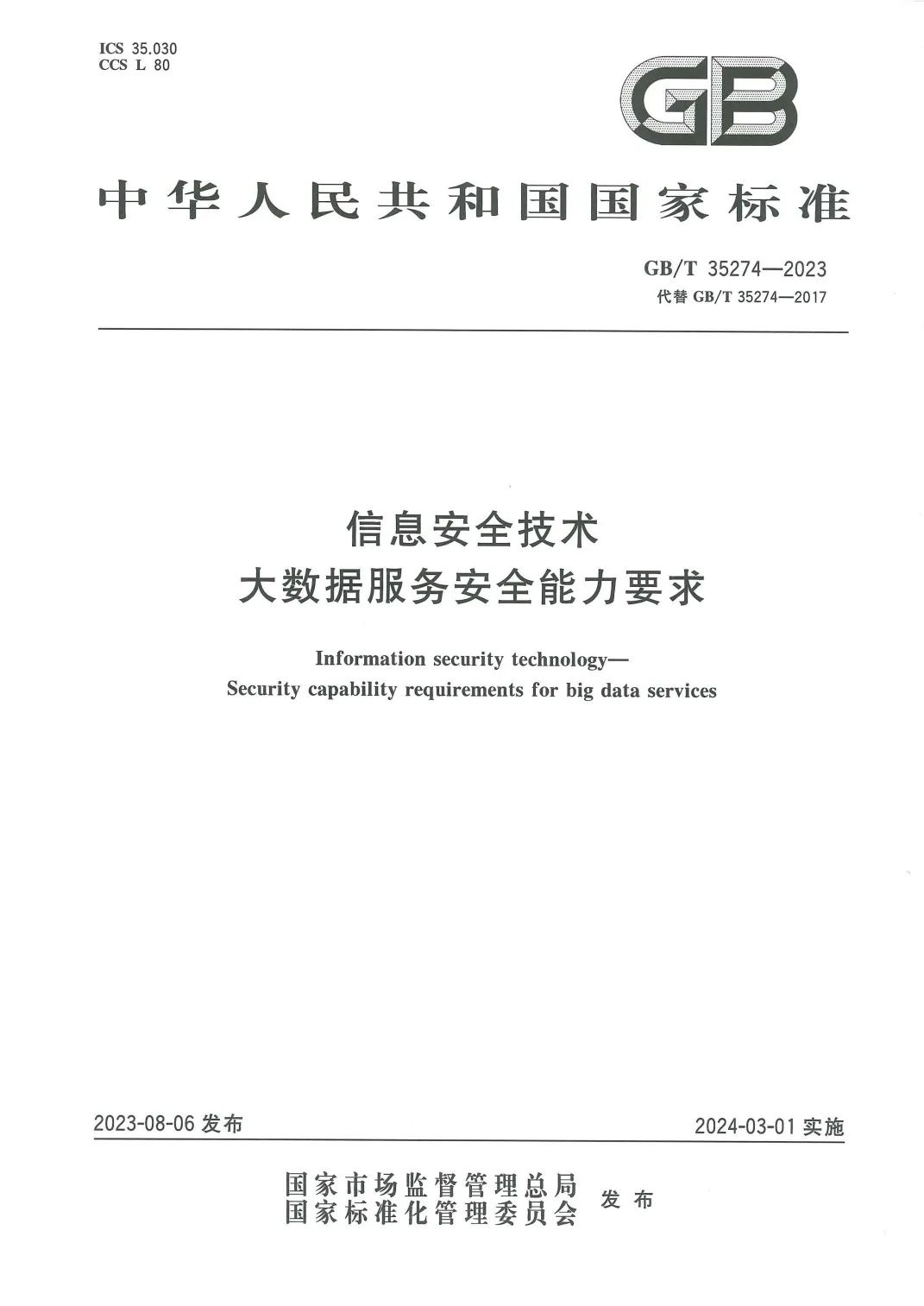 根据2023年8月6日国家市场监督管理总局、国家标准化管理委员会发布的中华人民共和国国家标准公告(2023年第7号),由清华大学牵头、深信服深度参编的国家标准GB/T 35274-2023《信息安全技术大数据服务安全能力要求》(以下简称:《标准》)获批发布,将于2024年3月1日开始正式实施。