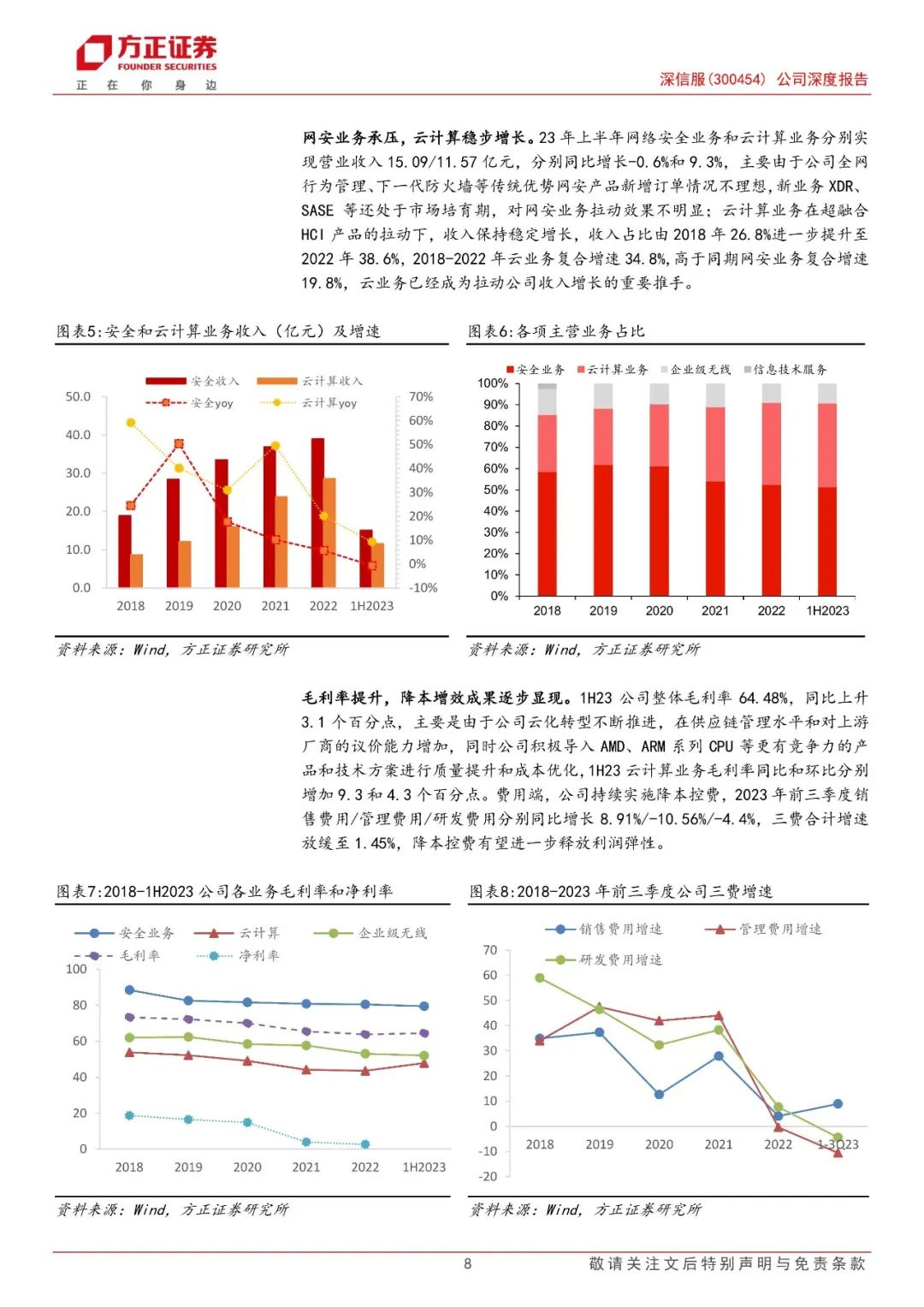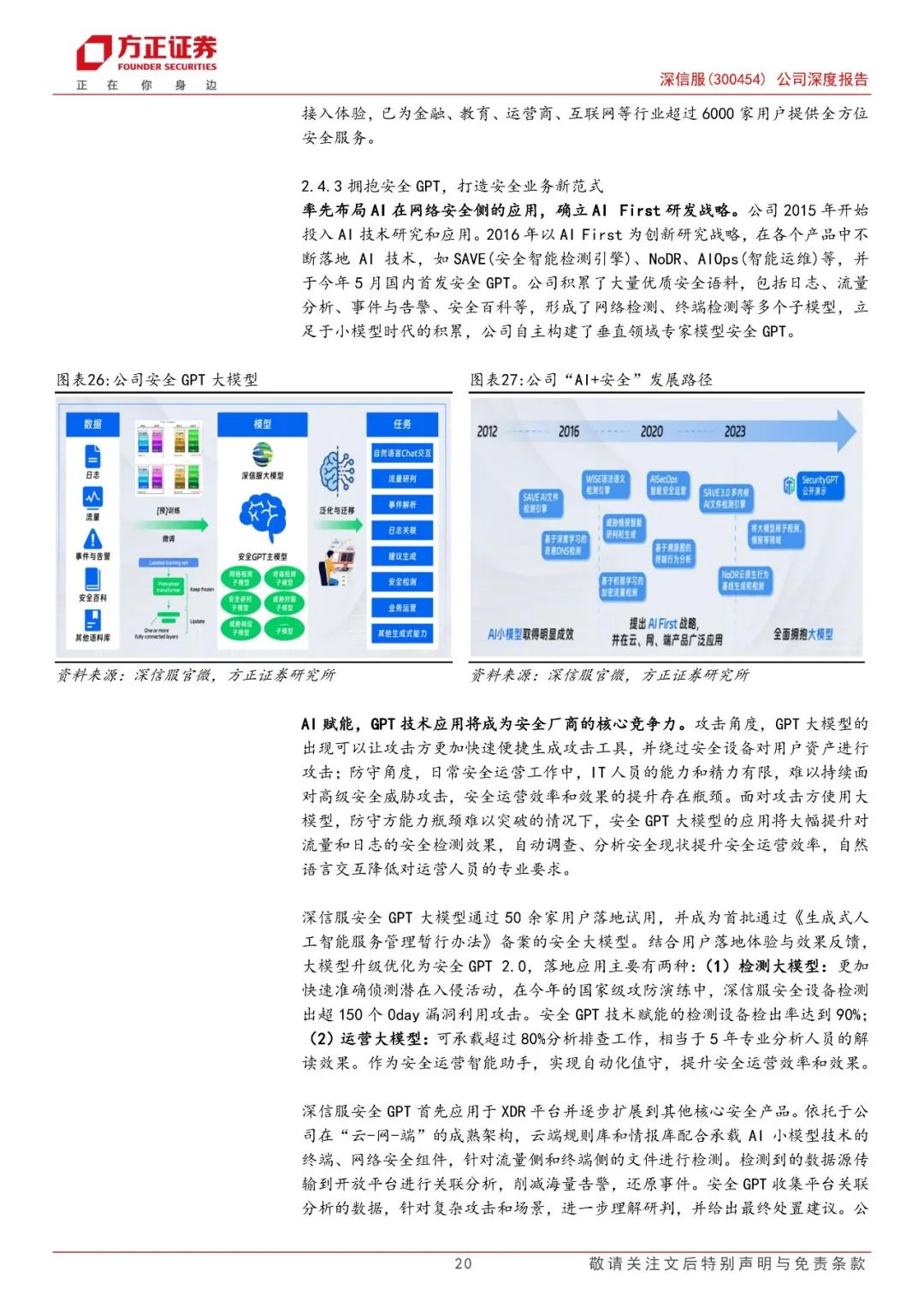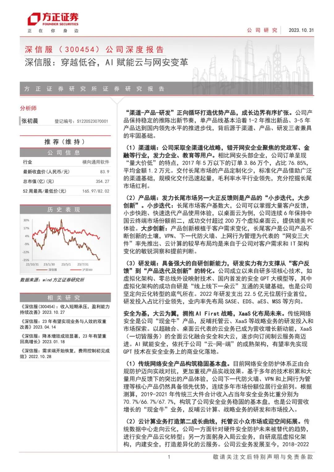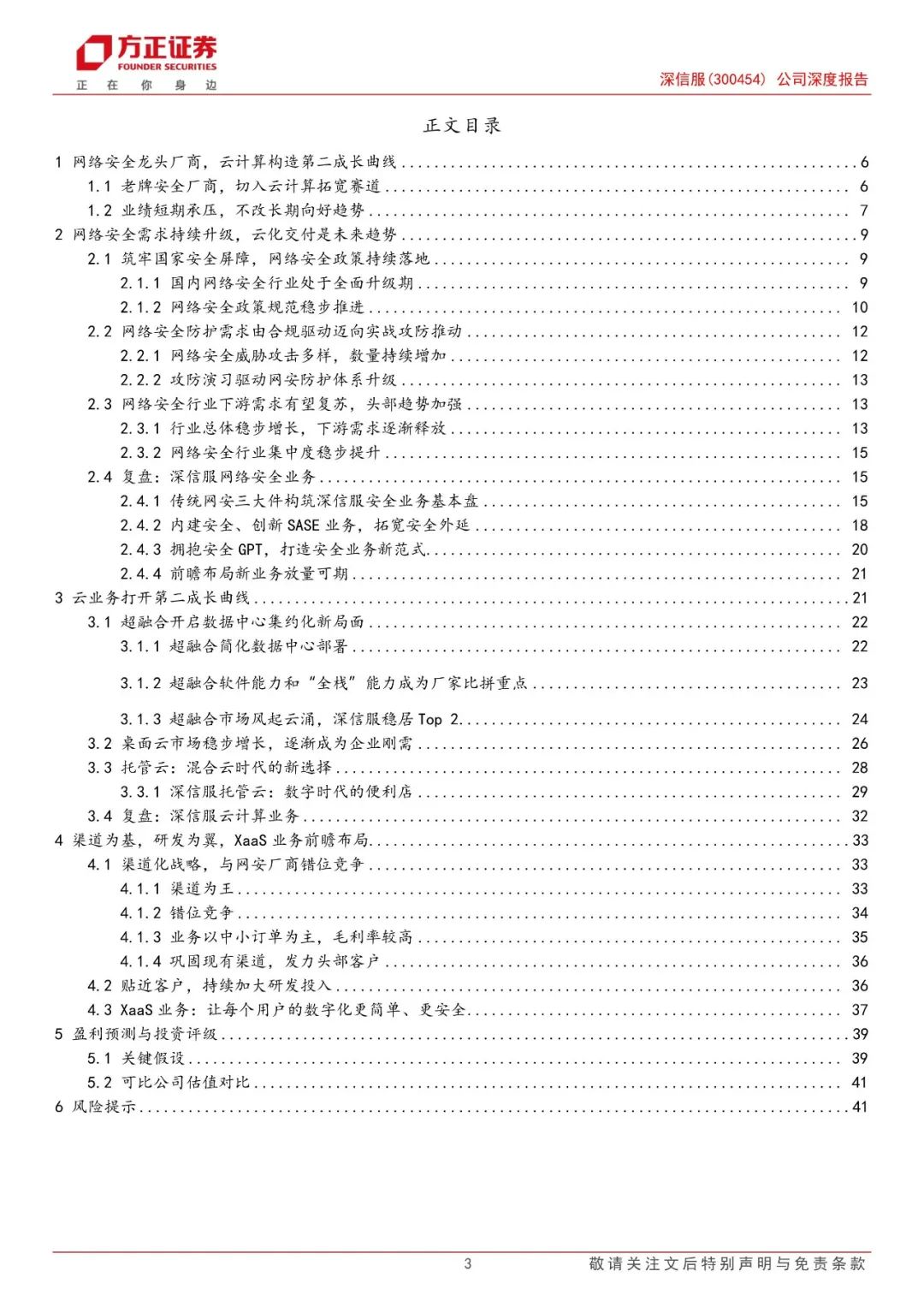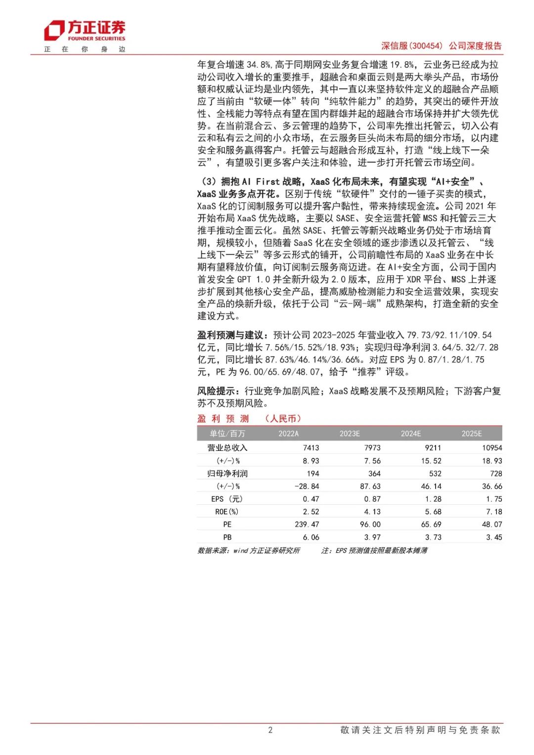 安全为基,大云为翼,拥抱AI First战略,XaaS化布局未来。传统网络安全是公司“现金牛”产品,反哺托管云、XaaS等战略业务的研发投入和市场探索。以超融合、桌面云代表的云业务已成为营收增长新动能,XaaS(一切皆服务)的全面云化融合安全和大云,逐步向订阅制云服务商迈进。AI赋能安全,依托于公司“云-网-端”的成熟架构,有望率先实现GPT技术在安全业务上的商业化落地。
