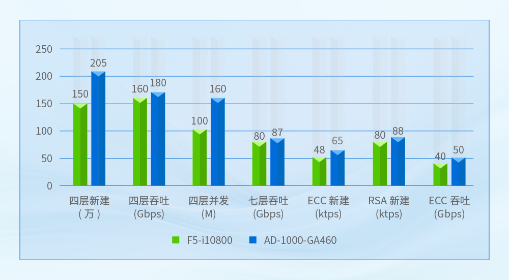 基于客户业务需要,测试客户现网在用的F5高端型号 i10800和深信服应用交付AD-1000-GA460,测试结果表明,深信服应用交付AD各项测试结果均优于F5:七层吞吐能力领先接近10%,四层吞吐能力领先12%,SSL各性能指标领先10%以上。