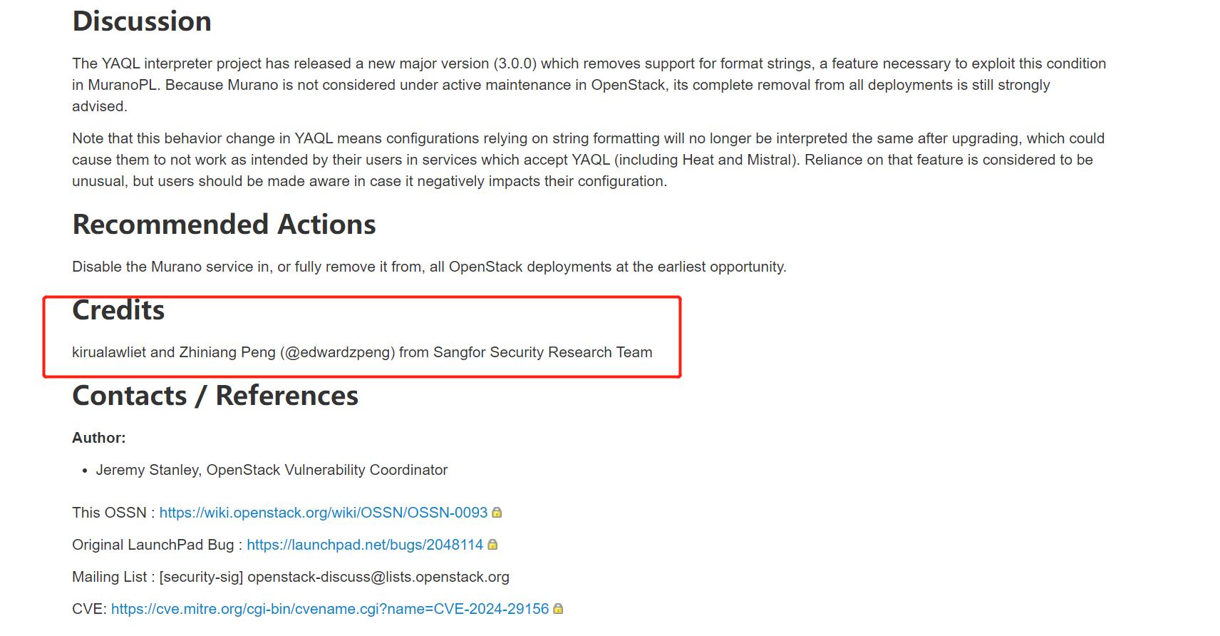 值得一提的是,该漏洞是深信服安全研究员lawliet和ZhiniangPeng在日常研究中发现的。深信服判断其可能导致潜在的安全风险,便积极与监管机构和OpenStack官方取得联系,将漏洞信息提交给了官方。OpenStack官方对此表示高度重视,并在第一时间发布了公告,提醒广大用户关注此问题。