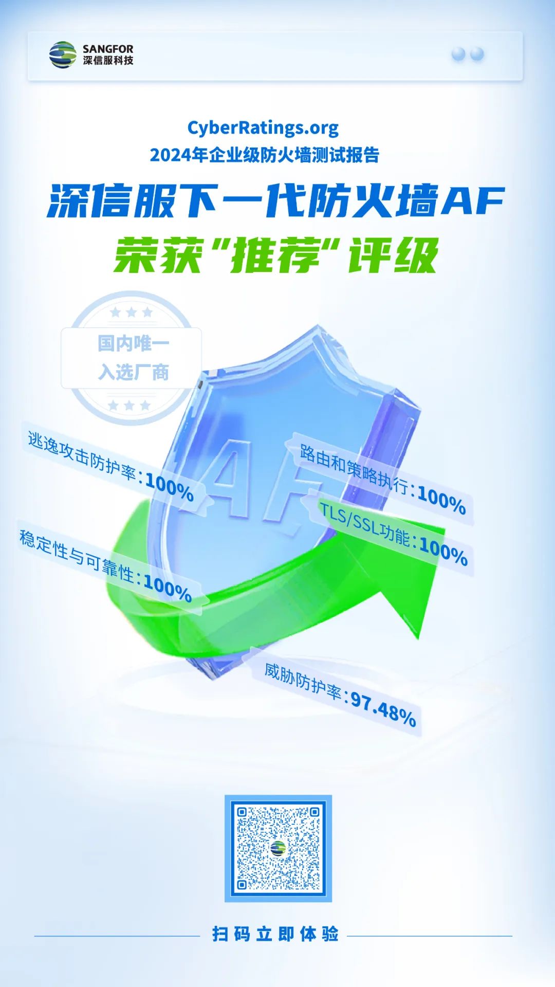 近期,CyberRatings.org发布2024年企业级防火墙测试报告,深信服下一代防火墙AF凭借在多维度严苛测试中的卓越表现,成为国内唯一荣获“推荐”评级的防火墙。
