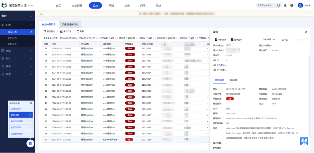 漏洞安全防护:支持对CVE-2024-38077的防御,可阻断攻击者针对该事件的入侵行为,相关产品及服务如下: