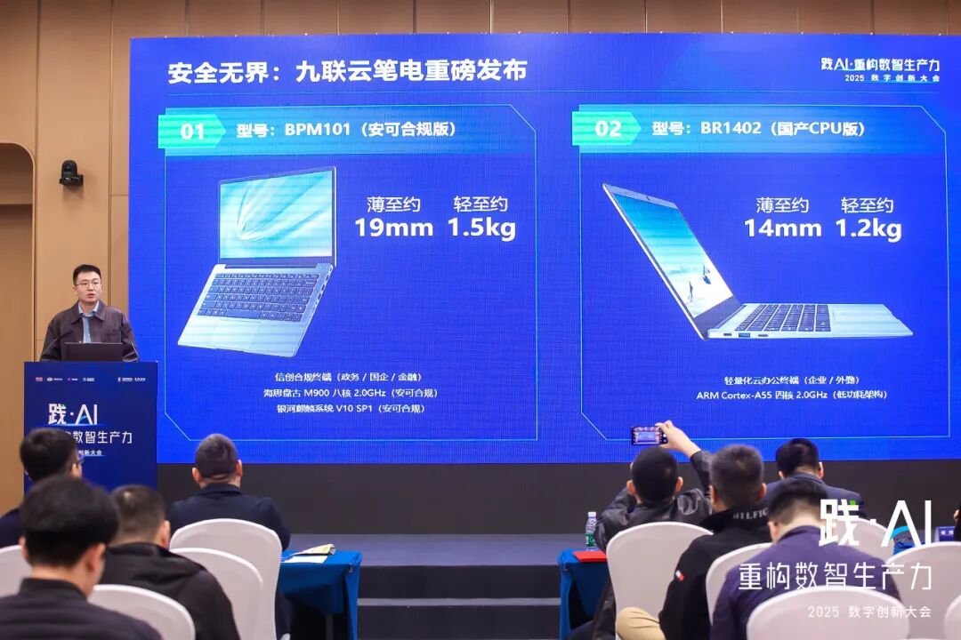 九联科技受邀出席大会,与院士专家、行业参与者等众多国内外重磅嘉宾共同分享AI赋能千行百业的洞察与实践。同时,九联科技与深信服科技共同重磅发布了两款合作云笔电产品——九联云笔电BPM101与九联云笔电BR1402。这两款云笔电以极致轻薄特性与多元适配能力,为不同领域办公带来革新体验。