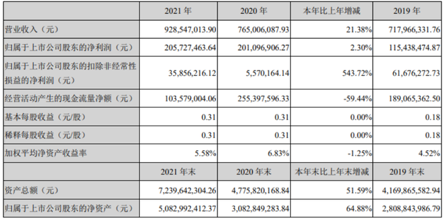集微网消息,3月30日,赛微电子发布2021年财报,年度实现营收9.29亿元,同比增长21.38%;归属于上市公司股东的净利润2.06亿元,同比增长2.3%;归属于上市公司股东的扣除非经常性损益的净利润3585.62万元,同比增长543.72%。