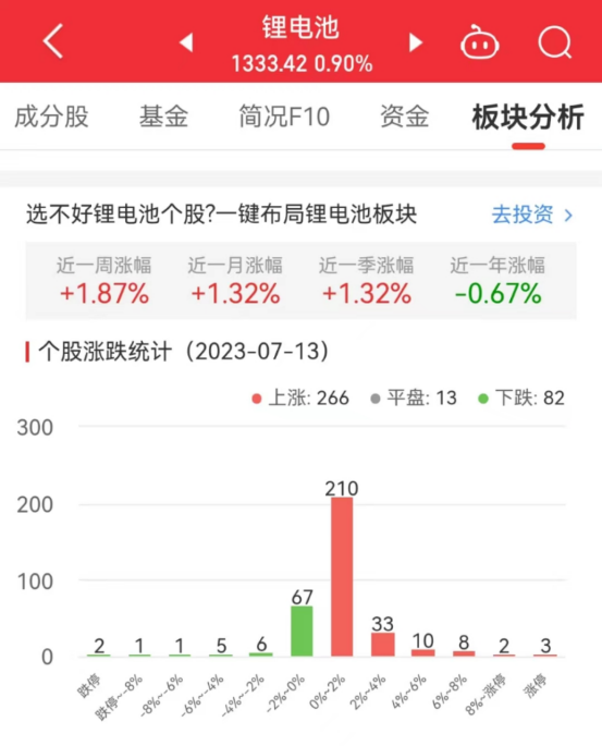 中国经济网北京7月13日讯今日,锂电池板块整体涨幅0.90%,其中266只股票上涨,13只股票平盘,82只股票下跌。