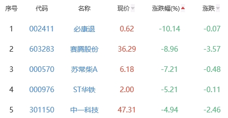 必康退、赛腾股份、苏常柴A、ST华铁、中一科技位列涨幅榜后五位,涨幅分别为-10.14%、-8.96%、-7.21%、-5.21%、-4.94%。