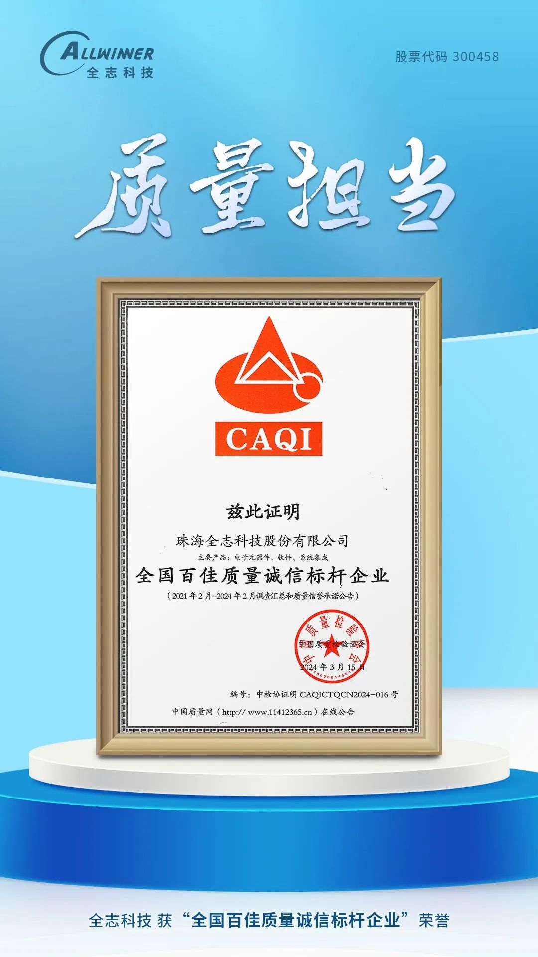 全志科技获全国百佳质量诚信标杆企业荣誉