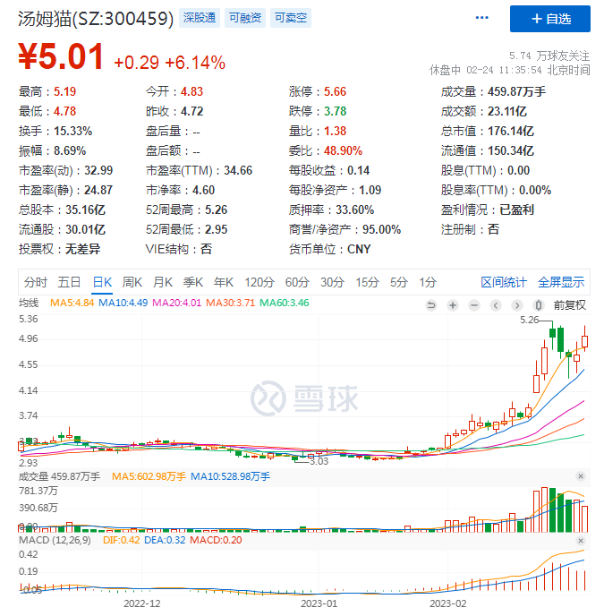 截至发稿,汤姆猫报5.01元/股,涨6.14%,总市值为176.12亿元。