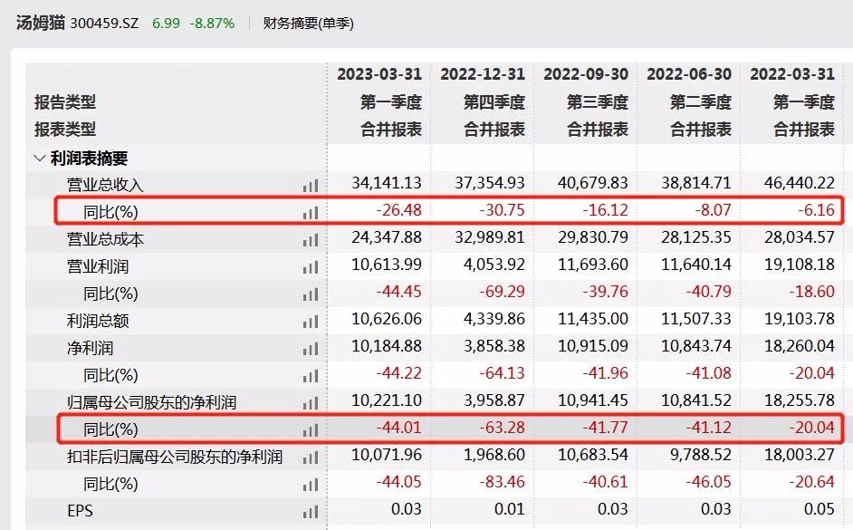 与股价走势形成鲜明对比的,是汤姆猫营业收入和净利润在2022年以来单季同比持续负增长,监管也在对其2022年度报告事后审查关注到了月活、资金等问题,出具的年报问询函中直言“使用客观平实语言阐述”。