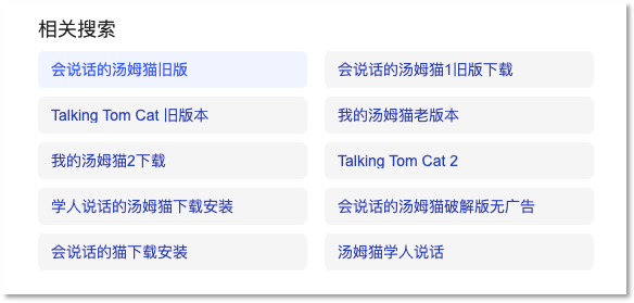在百度上搜索“汤姆猫”出现的“相关搜索”显示,许多用户搜索过“会说话的汤姆猫旧版”、“我的汤姆猫老版本”、“会说话的汤姆猫破解版无广告”等等。