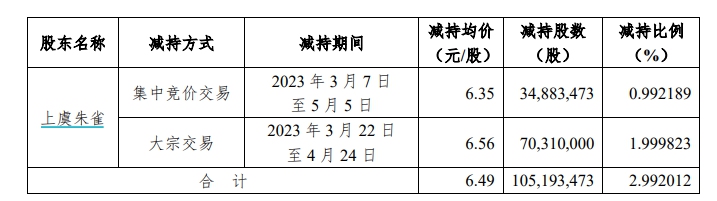 截至5月8日,针对上述减持计划的实施,上虞朱雀累计通过集中竞价交易及大宗交易的方式减持公司股份1.05亿股,占公司总股本的2.992012%。减持股份来源为其参与公司非公开发行股票所取得的特定股份(包括因公司资本公积转增股本产生的新增股份)。