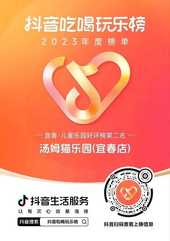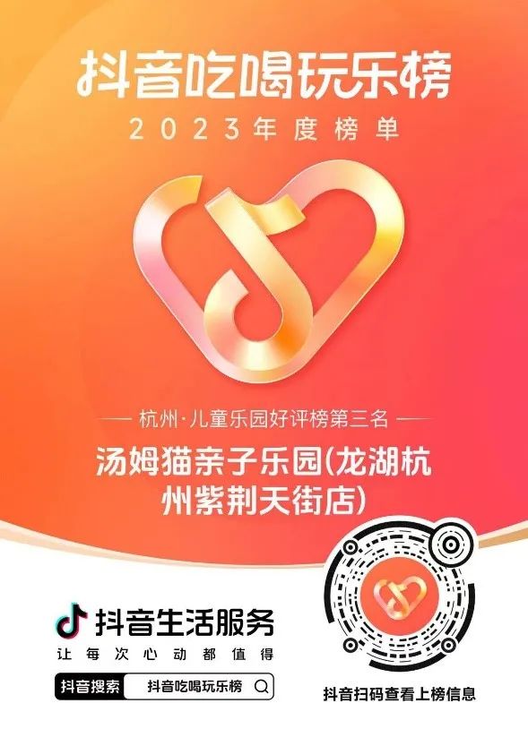 近日,抖音平台发布抖音吃喝玩乐榜2023年度榜单,汤姆猫亲子乐园杭州龙湖紫荆天街店、江西宜春店分别荣登2023年度吃喝玩乐榜杭州区、宜春区儿童乐园好评榜前三,再次印证汤姆猫线下亲子乐园作为儿童室内主题游乐标杆的高品质运营服务和优异的游育体验。该榜单是基于抖音休闲娱乐平台大数据,并根据2023年度好评度、受欢迎度等人气排名产生。