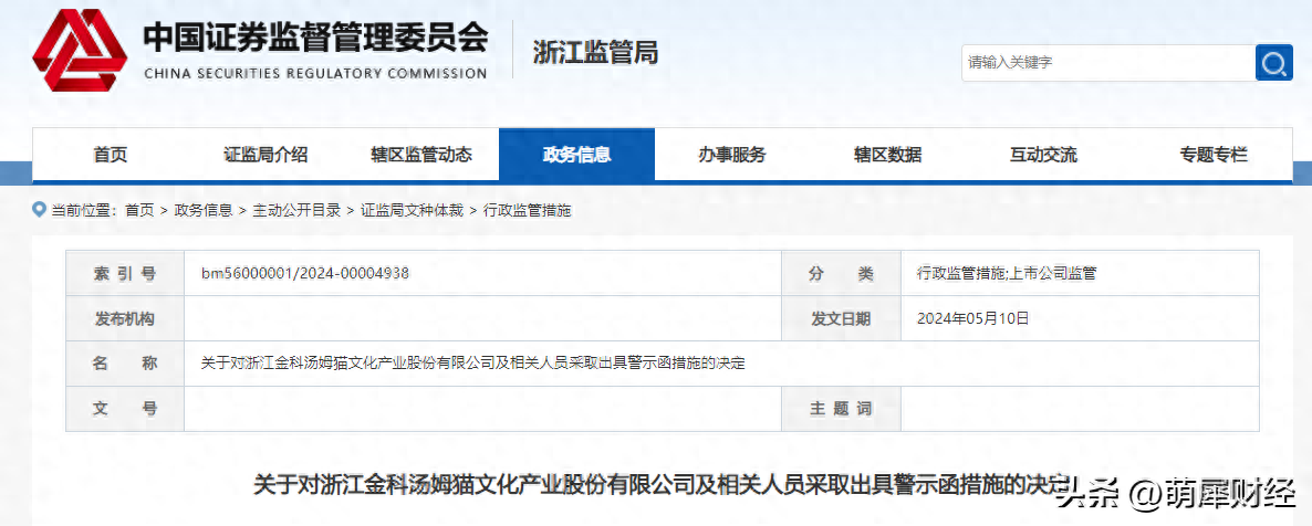 浙江证监局指出,汤姆猫以及公司董事长朱志刚、总经理张维璋、财务总监秦海娟、时任董事会秘书胡斐违反了《上市公司信息披露管理办法》的相关规定,浙江证监局决定对汤姆猫、朱志刚、张维璋、秦海娟、胡斐分别采取出具警示函的监督管理措施,并记入证券期货市场诚信档案。