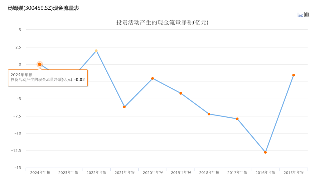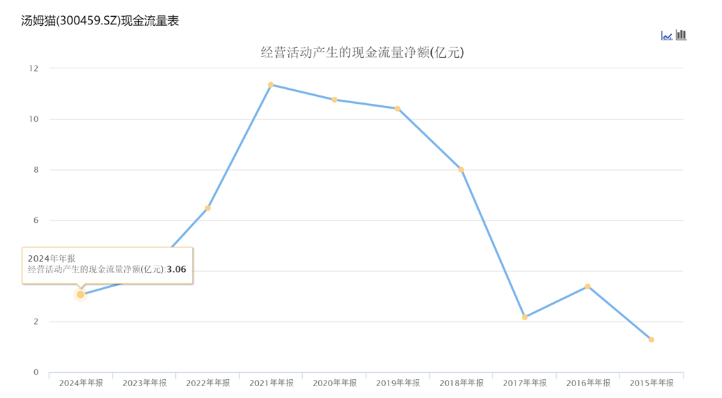 这使得公司货币资金逐年减少,更糟的是,汤姆猫的“现金牛”——经营性现金流净额也开始逐年减少。从2021年开始,公司的经营性现金流突然断崖式下跌,从峰值净流入11.35亿元迅速下降,到了2024年该项贡献现金仅剩3.06亿元,3年时间仅剩三分之一都不到。