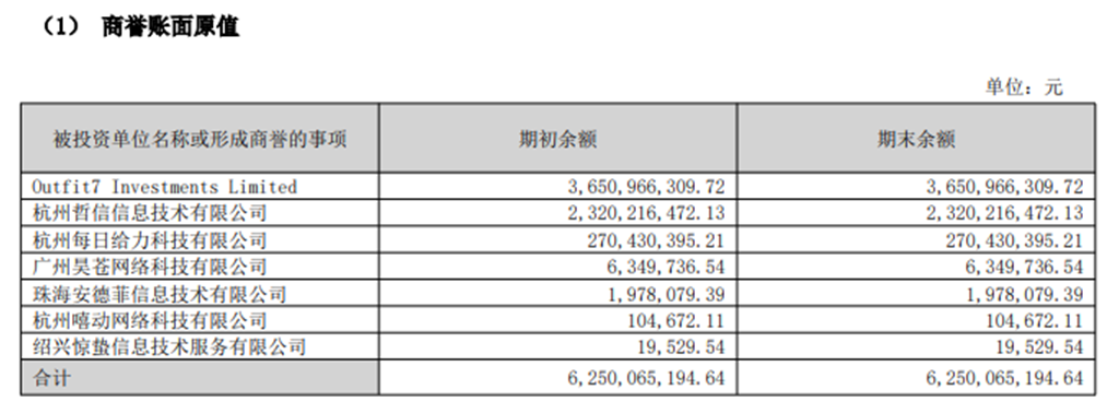 即便经过多次大额计提,截至2025年一季度末,汤姆猫账面商誉仍高达17.85亿元,占总资产比例达45.31%。其中,Outfit7、杭州哲信以及每日给力所产生的商誉分别为36.51亿元、23.20亿元、2.70亿元。