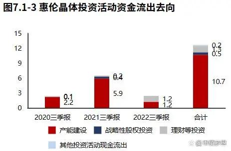投资流出减少,主要流向了理财等投资和产能建设。惠伦晶体2022三季报的投资活动资金流出,理财等投资占比最大,占比50.39%,此外产能建设也占比较大。惠伦晶体2020年报到本期的投资活动资金流出,集中在产能建设,占比83.75%。