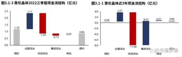 从惠伦晶体2022三季报的现金流结构来看,期初现金1.18亿元,经营活动净流入1.17亿元,投资活动净流出1.50亿元,筹资活动净流出0.15亿元,累计净流出0.32亿元,期末现金0.86亿元。经营活动具备一定的造血能力,能够为投资活动提供一定的资金支持,但并未能完全覆盖。