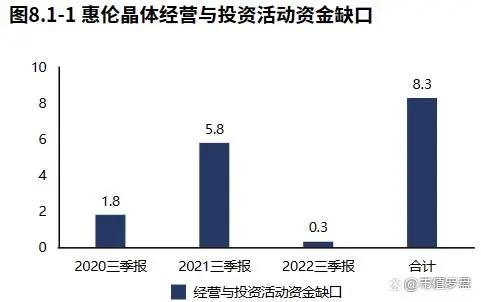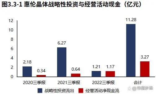 自身造血能力无法覆盖快速降低的战略性投资。战略投资资金流出1.21亿元,较2021三季报减少5.06亿元,增速-80.78%,战略性投资的资金投入快速降低。惠伦晶体2020年报到本期战略投资资金流出11.28亿元,经营活动产生现金净流入3.27亿元,经营活动的造血能力无法覆盖战略投资的资金流出。
