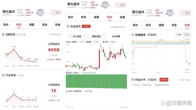 截至2022Q3,惠伦晶体在A股的整体排名下降至第4558位,在被动元件行业中的排名保持在第12位。截止2023年1月13日,北上资金并无特别信号。因为公司亏损,以近三年市盈率为评价指标看的估值曲线失效。