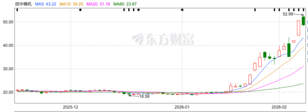 ?2026年以来,A股创业板再现“冰火两重天”的标的——田中精机(300461)。截至2月9日,公司近三个月股价从20.83元飙升至48.70元,涨幅高达133.80%,近一年涨幅亦达133.01%,短期更是斩获两连20cm涨停,总市值一度突破79亿元,成为资本市场最耀眼的黑马之一。