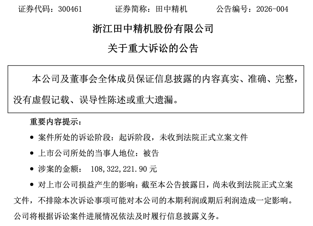 就在股价创下阶段性高点、市场情绪达到顶峰之际,田中精机披露的被起诉公告,成为打破市场狂欢的“黑天鹅”。