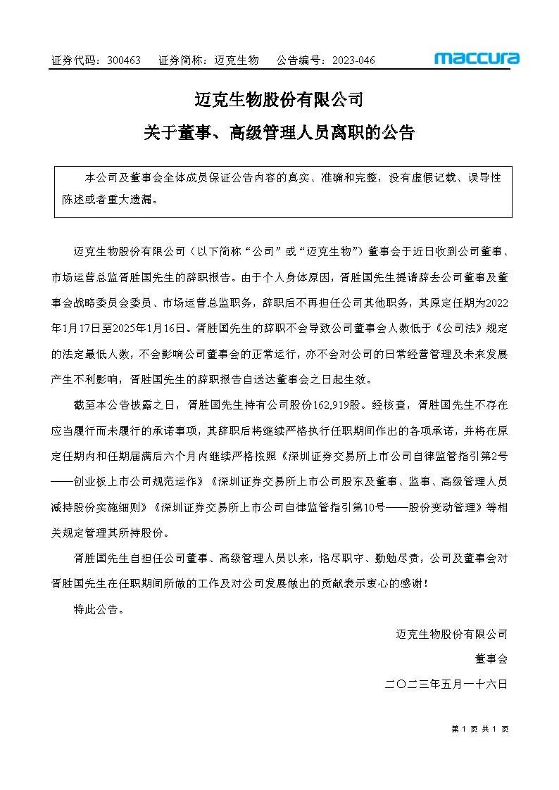迈克生物5月16日公告,公司董事、市场运营总监胥胜国由于个人身体原因提请辞去公司董事及董事会战略委员会委员、市场运营总监职务,辞职后不再担任公司其他职务。5月9日迈克发布公告称,由于个人原因,李波先生提请辞去公司商务总监职务,辞职后李波先生不再担任公司其他职务。