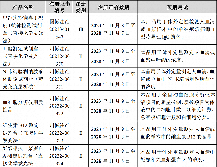 迈克生物11月13日公告,公司于近日收到国家药品监督管理局、四川省药品监督管理局颁发的《医疗器械注册证》。产品名称分别为单纯疱疹病毒1型IgG抗体检测试剂盒(直接化学发光法)、叶酸测定试剂盒(直接化学发光法)、N末端脑利钠肽前体测定试剂盒(荧光免疫层析法)、血细胞分析仪用质控品、维生素B12测定试剂盒(直接化学发光法)、妊娠相关血浆蛋白A测定试剂盒(直接化学发光法)。