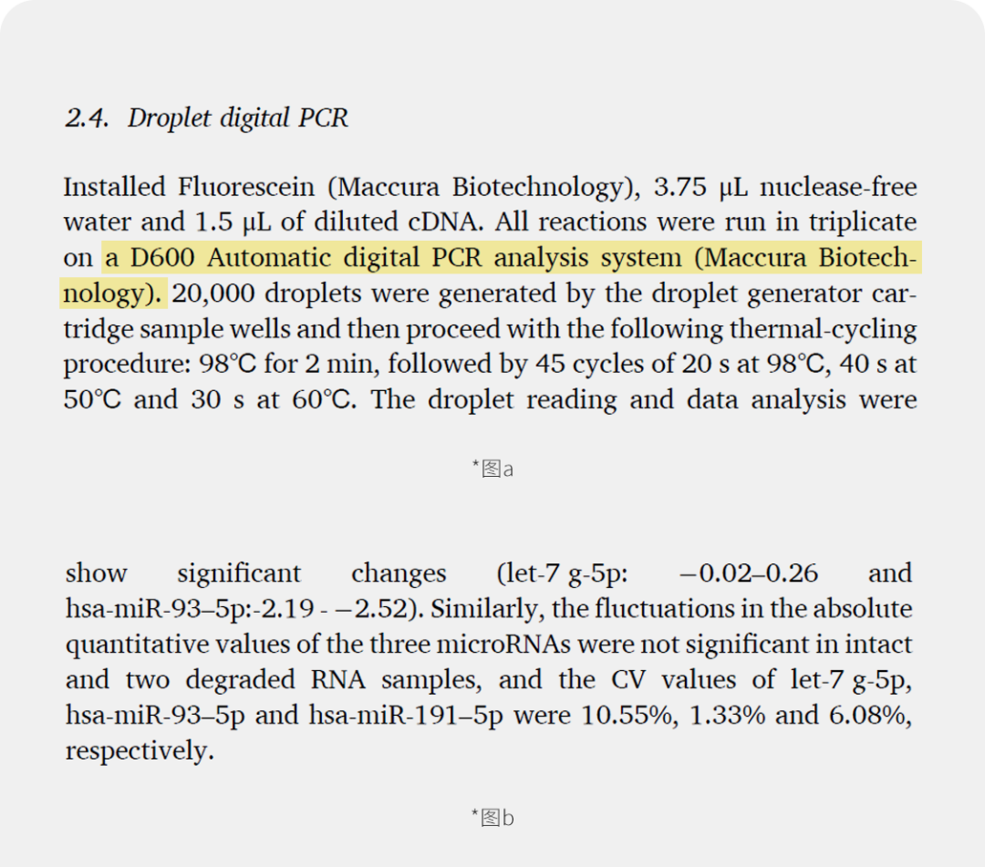 同时,研究者利用qPCR和迈克生物D 600全自动数字PCR分析系统(图a)检测了完整和严重降解RNA样本中三种miRNA(hsa-let-7g-5p、hsa-miR-93-5p和hsa-miR-191-5p)的表达水平。结果显示,与完整的RNA样本相比,严重降解的样本中三种miRNA的表达水平没有明显变化(图b),因此分析具有稳定区域或微小的RNA生物标志物对于降解程度较高的样本(例如体液斑等)是可靠的研究方式。