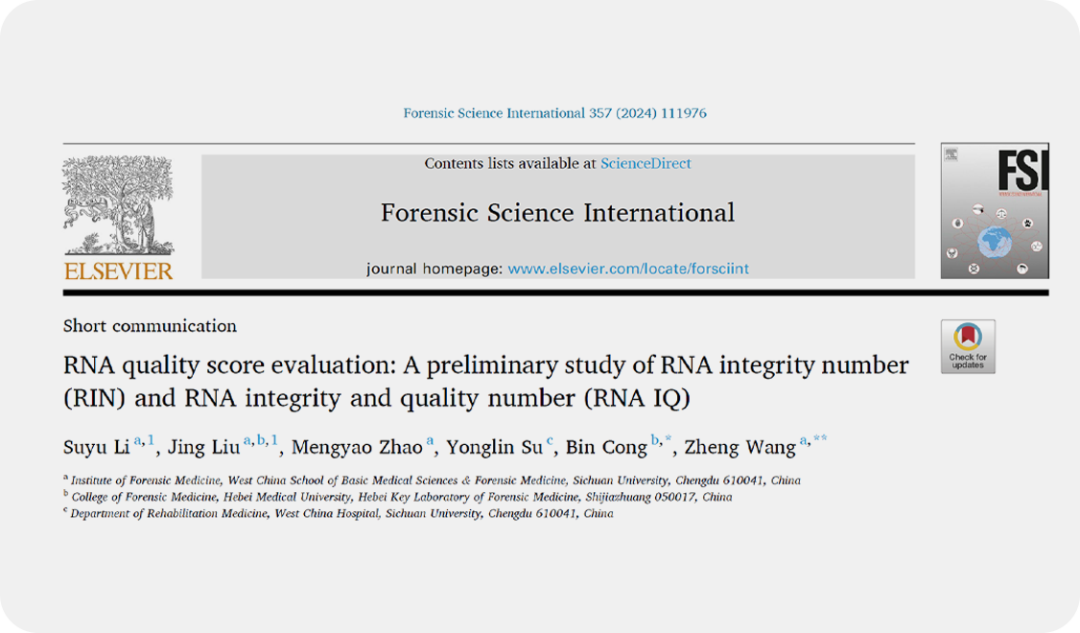 3月2日,四川大学华西基础医学与法医学院法医学研究所科研团队在ForensicScience International发表了题为“RNA quality scoreevaluation: A preliminary study of RNA integrity number (RIN) and RNA integrityand quality number (RNA IQ)”的研究论文,该研究评估了RIN值和RNA IQ值在RNA样本完整性检测中的性能,并通过迈克生物D 600全自动数字PCR分析系统评估了不同降解程度对RNA样本中3个miRNA表达水平的影响,为RNA生物标志物的分析提供了可靠的检测方法[14]。