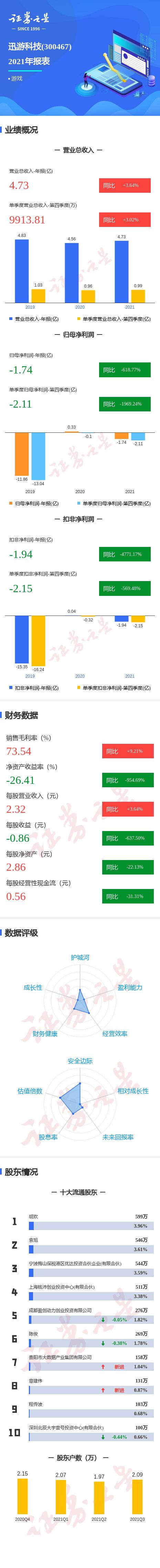 迅游科技2021年报显示,公司主营收入4.73亿元,同比上升3.64%;归母净利润-17420.53万元,同比下降618.77%;扣非净利润-19423.81万元,同比下降4771.17%;其中2021年第四季度,公司单季度主营收入9913.81万元,同比上升3.02%;单季度归母净利润-21198.88万元,同比下降1969.24%;单季度扣非净利润-21521.72万元,同比下降569.48%;负债率26.29%,投资收益-2849.52万元,财务费用452.66万元,毛利率73.54%。