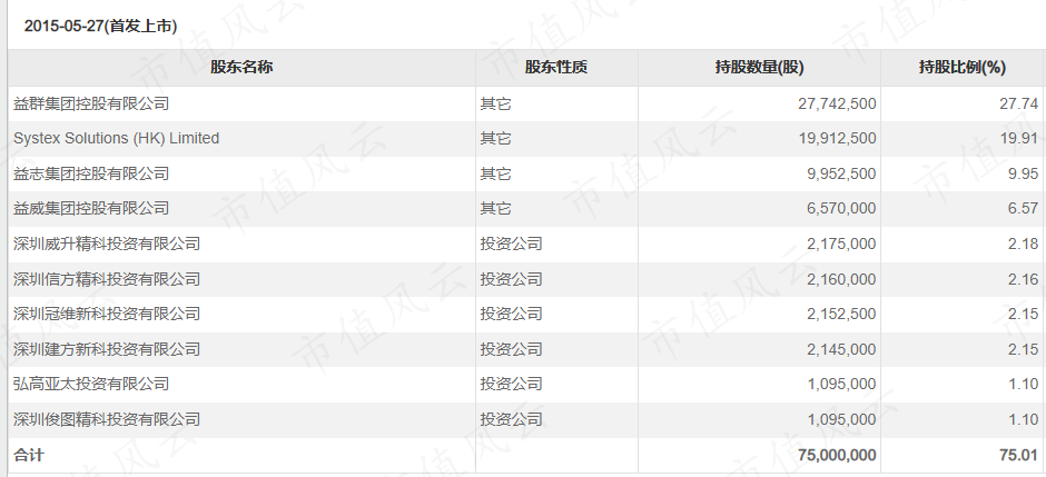 我们再把时间轴拉远来看。上市时,益群、益志、益威以及Systex Solutions分别持股27.7%、10.0%、6.6%、19.9%,共计64.2%。