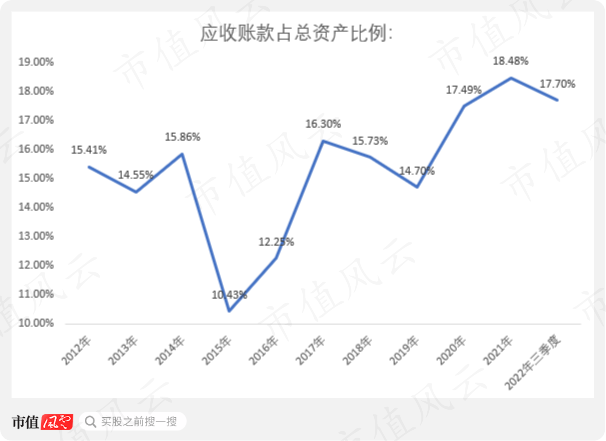 为方便比对,我们暂时将该项调整回溯,可以看出,调整后应收款占比在2020年增加销售投入后有明显上升,2021年更是再创新高,达到18.5%。2022年三季报中略有好转,但仍有17.7%。