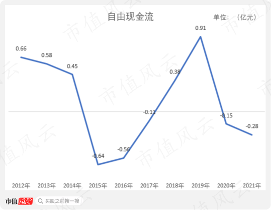 经营性现金流大幅下滑,自由现金流当然也不好看,2021年自由现金流已降至-0.3亿。