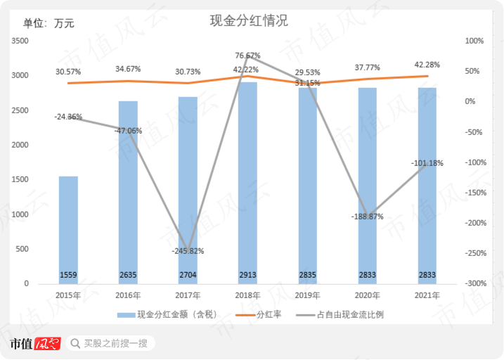 风云君测算下来,2015-21年之间,公司自由现金流累计-0.5亿元。总结就是:在不影响正常经营活动的前提下,公司其实并不具备分红能力,而实际现金分红则高达1.8亿元。