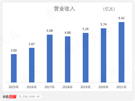 2015~2021年七年以来,四方精创的营收整体呈现上升趋势,从3亿上升至6.4亿,上升114%,年均增长率为11.5%。