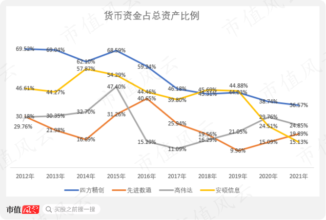 再看货币资金。根据2021年年报,四方精创持有货币资金达4.8亿,占总资产36.6%。即使看近十年,四方精创的货币资金占比也明显比可比公司高出一截。