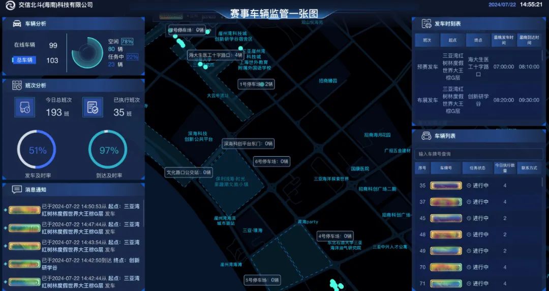 为确保赛事期间的交通管理高效、安全和有序,交信北斗(海南)技术团队为赛事车辆调度定制了一套专门的调度系统,该系统旨在帮助赛事举办方有效管理和监控赛事期间的车辆调度。通过集成车载定位设备和实时数据处理,系统可以灵活地调度车辆、提供实时信息服务,并对异常情况进行预警和处理。赛事准备期间,为100多辆辆赛事交通保障车安装北斗定位终端。在赛事中,保障车辆的轨迹数据实时反馈到赛事监管“一张图”进行大屏展示,有效辅助管理人员远程指挥调度,实现交通调度数字化,精准化,智能化。