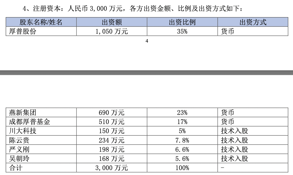 11月25日,厚普股份发布公告称,11月24日,厚普股份与燕新集团、成都厚普基金、川大科技、陈云贵、严义刚、吴朝玲签订了《成都集氢科技有限公司(暂定名)之合资协议》。各方拟共同出资设立成都集氢科技有限公司(暂定名称,简称“成都集氢”)。总投资3000万元,其中厚普股份认缴1050万元,持股比例为35%。