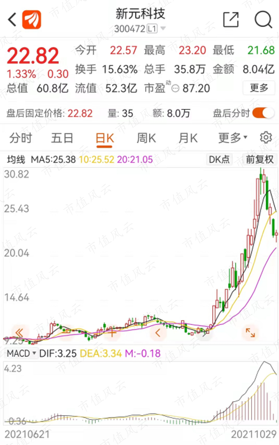 2021年9月22日至10月21日,新元科技(300472.SZ)的股价由11.15元/股涨至29.44元/股,17个交易日4条20cm大长腿,涨势很是凶猛。