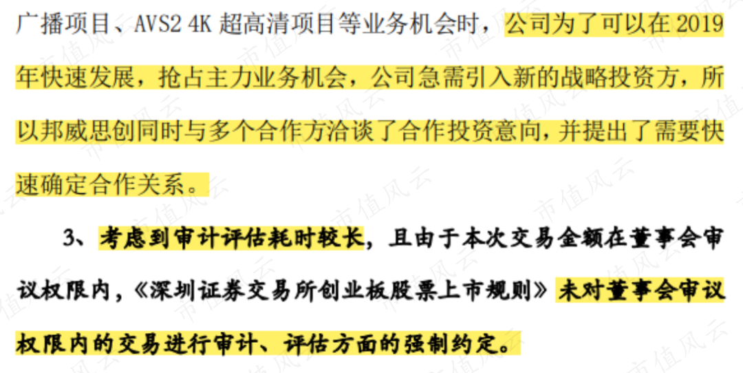 更搞笑的是,此次收购邦威思创,甚至都没进行审计或评估!也就是说,收购价7,650万是拍脑袋拍出来的啊!