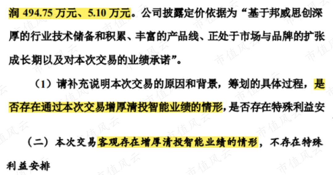 可能是清投智能的“套娃式”并购引起了深交所的注意,上市公司随即收到了关注函,要求说明此次收购邦威思创,是否有增厚清投智能业绩的嫌疑。