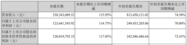 其中,第三季度景嘉微实现营业收入3.38亿元,同比增长115.95%;实现归属于上市公司股东的净利润约1.24亿元,同比增长114.75%;实现归属于上市公司股东的扣除非经常性损益的净利润1.20亿元,同比增长117.05%。