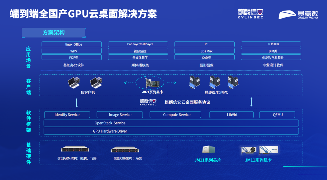 本次合作,双方将重点推进产品与技术的高度整合。麒麟信安将基于景嘉微11系列GPU的图形处理与算力特性,在麒麟信安操作系统、虚拟化产品及解决方案中进行深度适配与优化,共同打造高性能、高安全、全栈国产的GPU云桌面超融合一体机等创新产品。通过“生态融合、产品融合、行业融合”的三融合模式,双方致力于为客户提供体验流畅、安全可信、自主创新的云与桌面算力底座,满足政企、电力、金融等高安全场景下对图形渲染、数据处理的严苛需求。