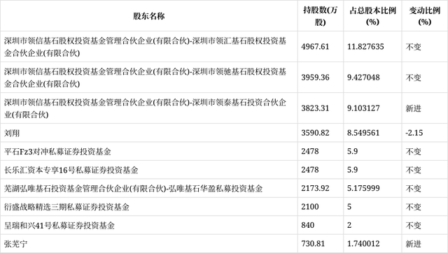 三季报显示,2022年三季度末的公司十大流通股东中,新进股东为深圳市领信基石股权投资基金管理合伙企业(有限合伙)-深圳市领泰基石投资合伙企业(有限合伙)、张芜宁。在具体持股比例上,刘翔持股有所下降。