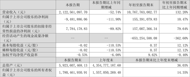 根据三季报,公司第三季度实现营业总收入21.23亿元,同比下降52.74%,环比下降56.52%;归母净利润-948.19万元,同比下降111.90%,环比下降108.62%;扣非净利润778.42万元,同比下降89.82%,环比下降91.05%。