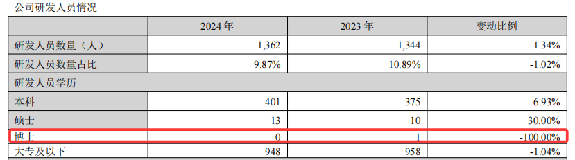 2024年公司研发人员1362人,较2023年仅增1.34%,研发人员占比从10.89%降至9.87%,近七成研发人员为本科以下学历,博士学历研发人员从2023年的1人变为0人,高端科研人才储备出现断层,限制了前沿技术突破能力,影响公司在高端领域的技术储备和市场竞争力。