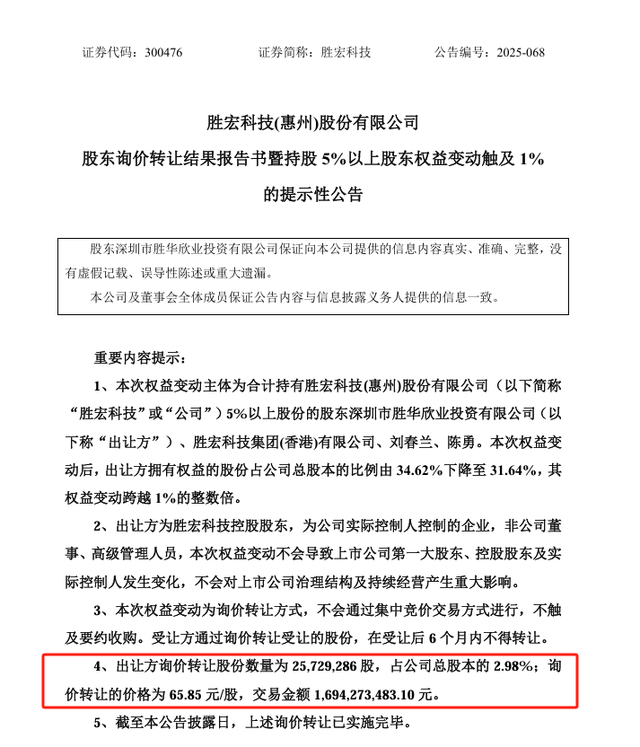 财富兑现早已开始。2025年5月,陈涛夫妇已通过深圳市胜华欣业投资有限公司向22家机构转让胜宏科技股权,套现16.94亿元。陈涛、刘春兰对该公司的持股比例分别为90%、10%。