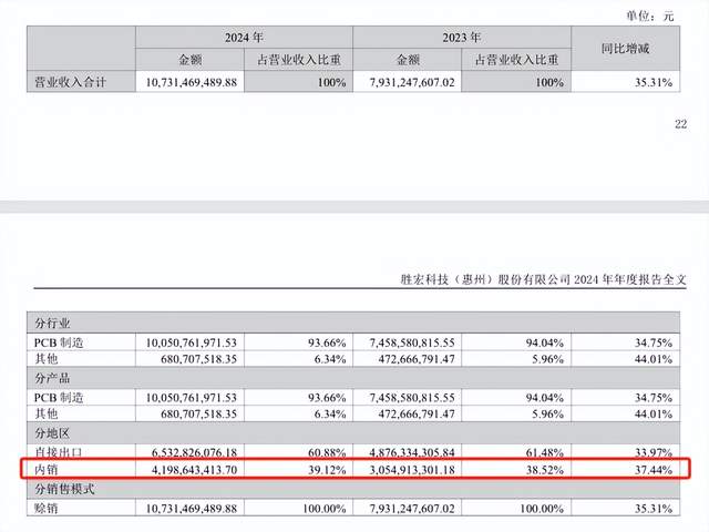 之所以要加码越南,与胜宏科技的收入重心在海外有极大关系。财报数据显示,2024年,公司直接出口实现营收65.33亿元,占同期总收入比重为60.88%。